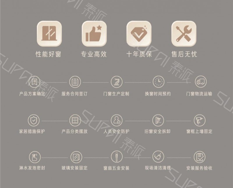 此外,素派门窗五星安装标准,从辅材用料,到安装规范,把握安装精度,优化窗框与洞口间的密封,实现好门窗+好安装+好服务的有效落地。