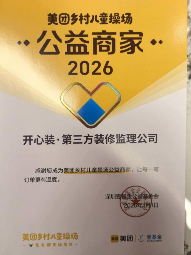 烟火藏居所,善意赴远山。开心装第三方装修监理,深耕上海本土家装服务领域多年,始终坚守独立中立的服务初心,用专业守护万千家庭的安居梦想,用长期坚守践行企业社会责任。凭借稳定优质的服务口碑与持续践行的公益行动,品牌于2025 年、2026 年连续两年,斩获美团公益与深圳壹基金公益基金会联合颁发的公益商家官方授牌,成为上海家装监理行业内兼具专业实力与人文温度的本土正规服务品牌。